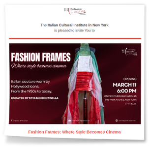 “La nuova edizione della mostra Fashion frames” è tributo alla moda italiana, e opportunità per celebrare la nostra cultura e il nostro patrimonio,” dichiara il curatore Stefano Dominella. “Per la prima volta dopo tanti anni a New York, presso l’Istituto Italiano di Cultura, sono esposti il valore del saper fare, la bellezza e lo stile che hanno reso celebre il Made in Italy nel mondo”.