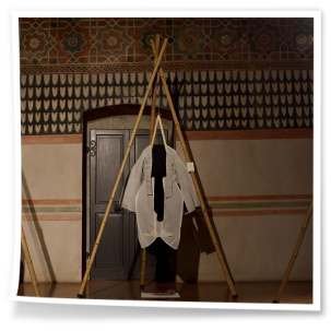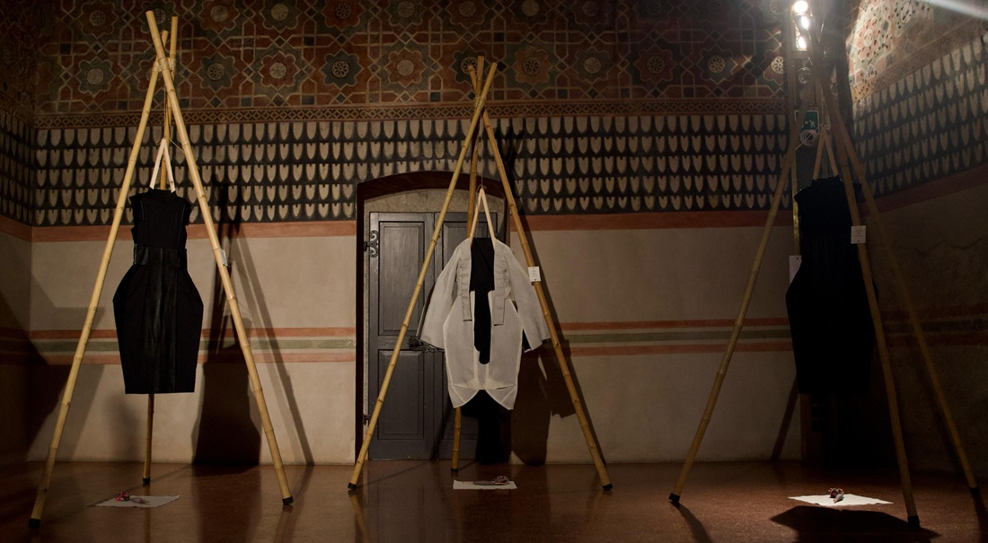 Le creazioni sartoriali VesteMMundi, realizzate con tessuti e tecniche tradizionali dei paesi visitati, sono state esposte su grucce artigianali.