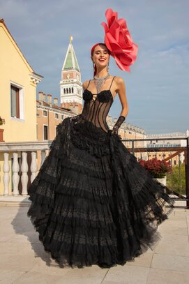 Gli abiti lunghi seguono la lunghezza delle gonne. I giacchini di pelle sono ricamati in materiali ultra preziosi: piume, strass, swarovski, inserti di pellame con lavorazioni geometriche e contrasti di colore e materiali. I corpini sono realizzati anch’essi con delle forme geometriche bordate di piume in tinta con la pelle, I gilet smanicati e iper ricamati richiamano nei motivi la figura della Kahlo. La palette cromatica spazia dal nero, nuance cara allo stilista, fino ai bluette, celeste, verde acqua. Ad impreziosire i look in passerella ci saranno copricapi unici, realizzati interamente a mano da Florilegio con fiori di carta intagliati e dipinti, frutto di un lavoro corale che unisce maestria e visione. I fiori per la Kahlo non erano solo elementi decorativi, ma un mezzo per esplorare e rappresentare la bellezza, la vita e le emozioni, anche quelle più difficili come il dolore, al punto che affermava: “Dipingo i fiori per non farli morire”.