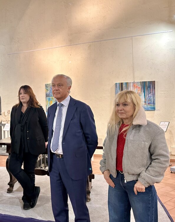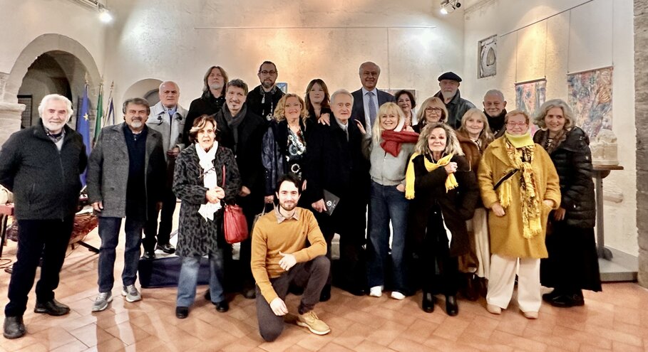 Tutti gli artisti in mostra con il sindaco di Marino Stefano Cecchi, l’assessore alla Cultura Pamela Muccini, la presidente dell’Accademia Castrimeniense Marina Funghi, lo scultore Paolo Marazzi e Franco Campegiani.
