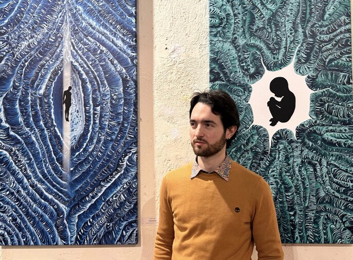 Federico Gelli e le sue opere “Introspezione” a sinistra e “Radicamento” a destra in colata acrilica su tela 70x140