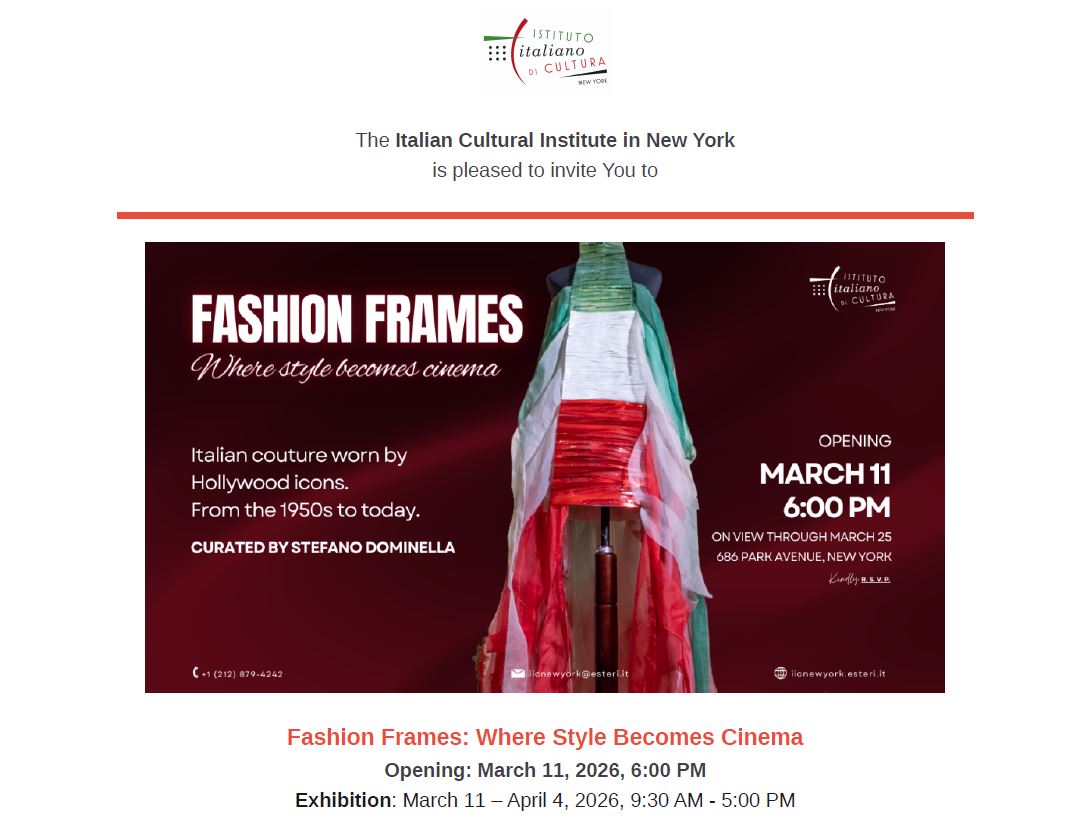 “La nuova edizione della mostra Fashion frames” è tributo alla moda italiana, e opportunità per celebrare la nostra cultura e il nostro patrimonio,” dichiara il curatore Stefano Dominella. “Per la prima volta dopo tanti anni a New York, presso l’Istituto Italiano di Cultura, sono esposti il valore del saper fare, la bellezza e lo stile che hanno reso celebre il Made in Italy nel mondo”.