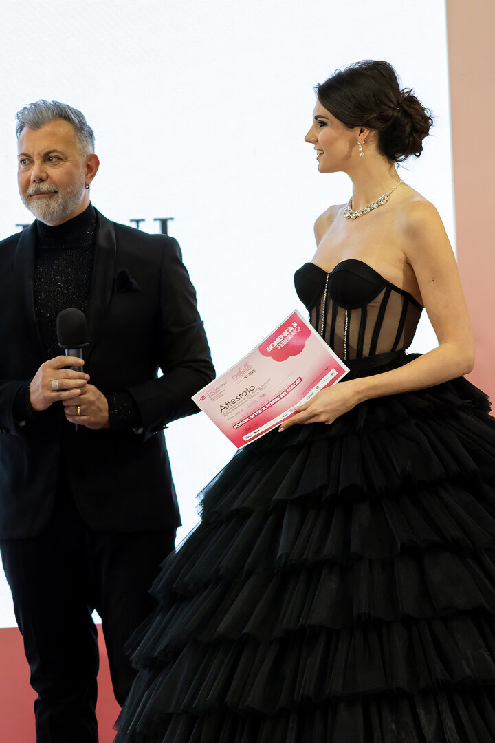 Testimonial della collezione di Andrea Sbarrini è stata Miss Universo Italia 2025, Lucilla Nori, che in apertura di sfilata ha reso omaggio - su idea di Sbarrini - all’imperatore della moda Valentino Garavani.