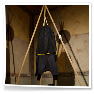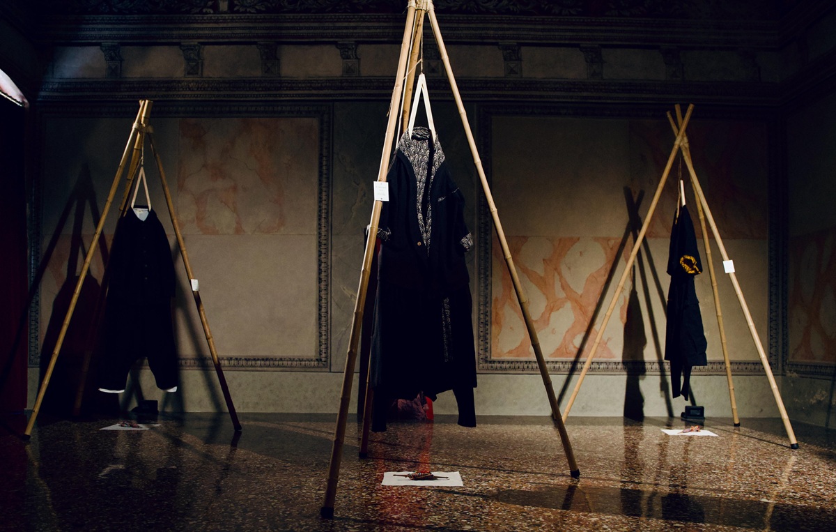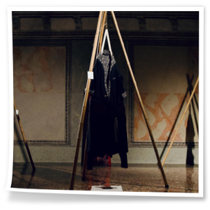 Le creazioni sartoriali VesteMMundi, realizzate con tessuti e tecniche tradizionali dei paesi visitati, sono state esposte su grucce artigianali.