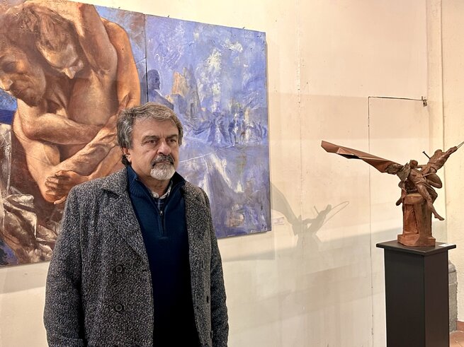 Stefano Piali, scultore e pittore. “Esodo” è il titolo sia dell’opera pittorica, acrilico e olio su tavola 180x120 (Dittico dal ciclo delle tavole graffiate) sia della scultura in terracotta patinata, ferro e rame, unico esemplare