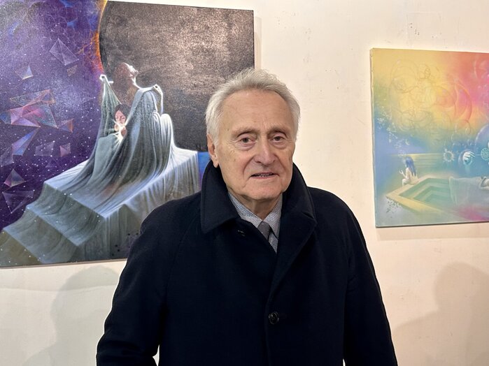Lo scrittore e critico d’arte Franco Campegiani. Alle sue spalle le opere di Vito Lolli