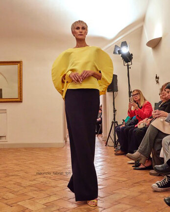 Il suo defilè si è svolto in concomitanza con “Seduzioni, quando il metallo diventa desiderio” la mostra di Andrea Borga. alla Coffee House di Palazzo Colonna a conferma che la moda guarda l’arte e viceversa.