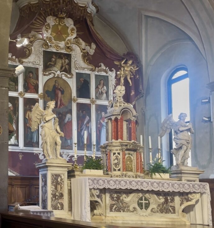 Altare della Chieda Arcipretale di Santa Maria Assunta a Lentiai con alle spalle il trittico realizzato nella bottega di Tiziano Vecellio (ph Loredana Gelli)