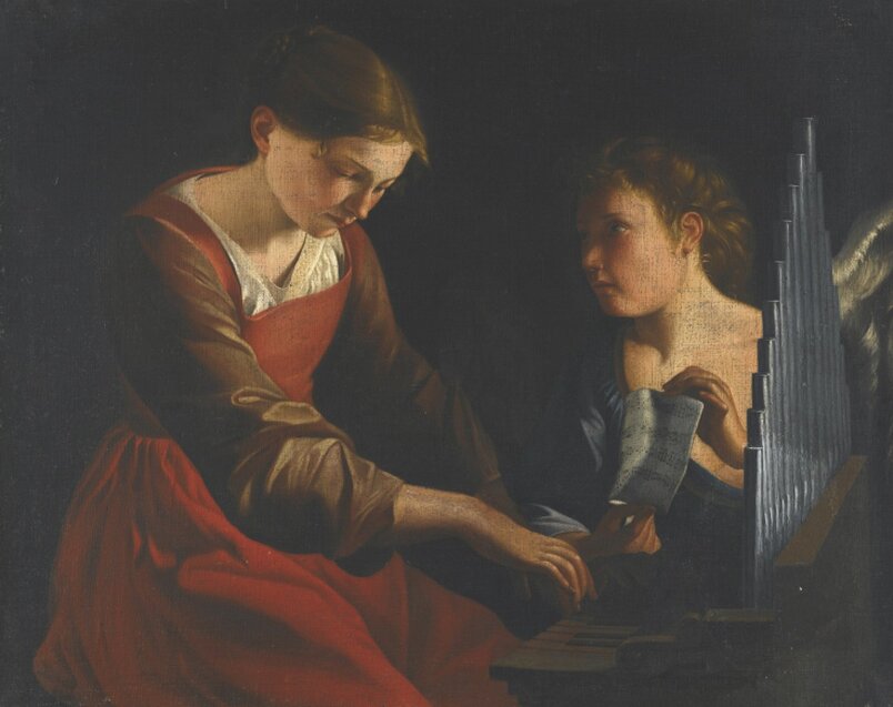 Orazio Gentileschi Santa Cecilia e un angelo XVII sec. Olio su tela 83,4 x 105,2 cm. Collezione privata. La luce in questo caso è anche la luce dell’angelo che porta la grazia e il riflesso che illumina il volto. Una curiosità: Caravaggio nel suo atelier aveva fatto distruggere il soffitto per far entrare la luce dall’alto.